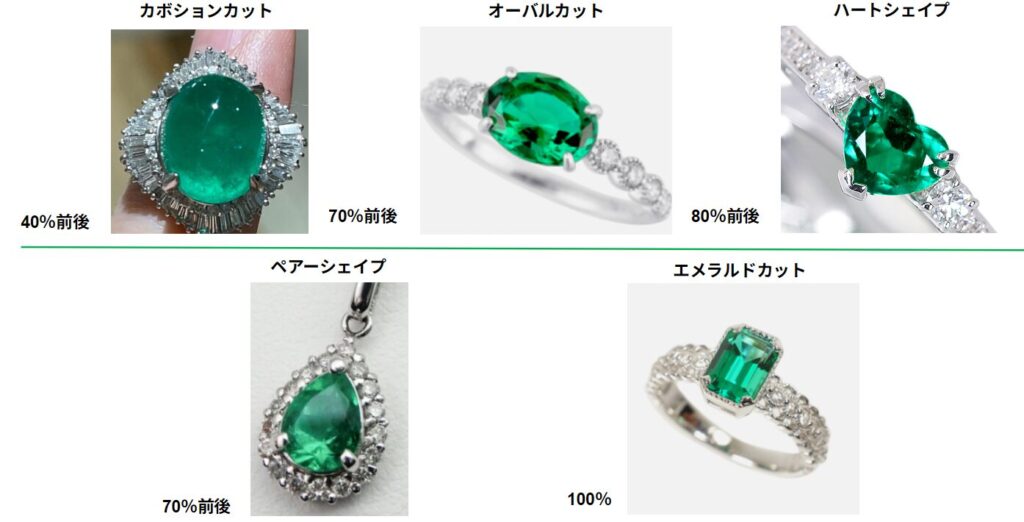 オーバル・ペアシェイプ・ハートなども存在しますが、市場評価はエメラルドカットが最上位です。
